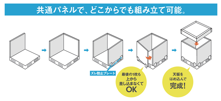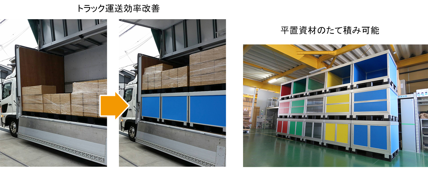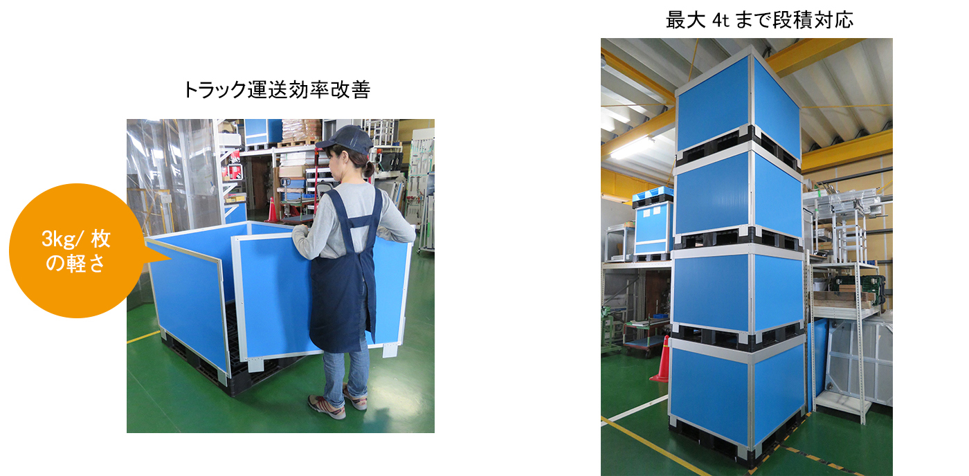 アルミフレームとプラダンにより強度と軽さを両立化させ、ネステナー不要で資材置場や荷台空間を最大限に有効活用できる折りたたみ式物流BOXです。パレットぎりぎりサイズで省スペース効率化を実現。トラックでは運送効率改善を実現します。