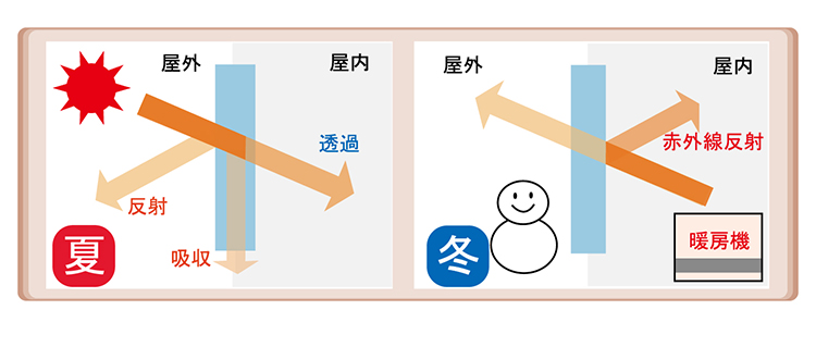 ②冬は暖房機の赤外線を室内に反射。断熱効果により、室内暖房の効率アップ⇒暖房電力/燃料ダウン