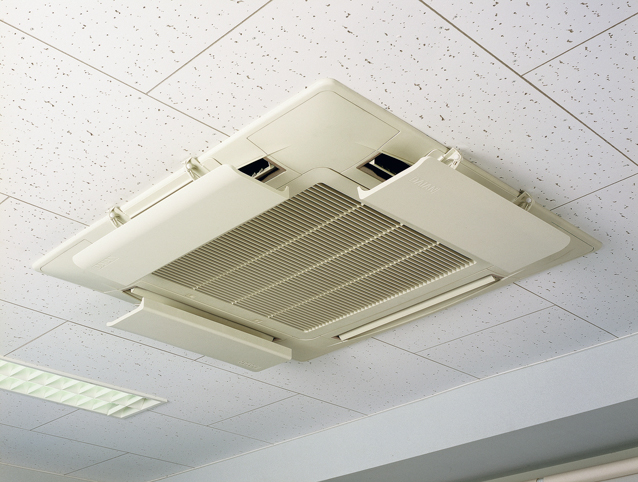 オフィスの天井カセット型エアコンの風を分散し、さらに部屋内の空気を分散循環。