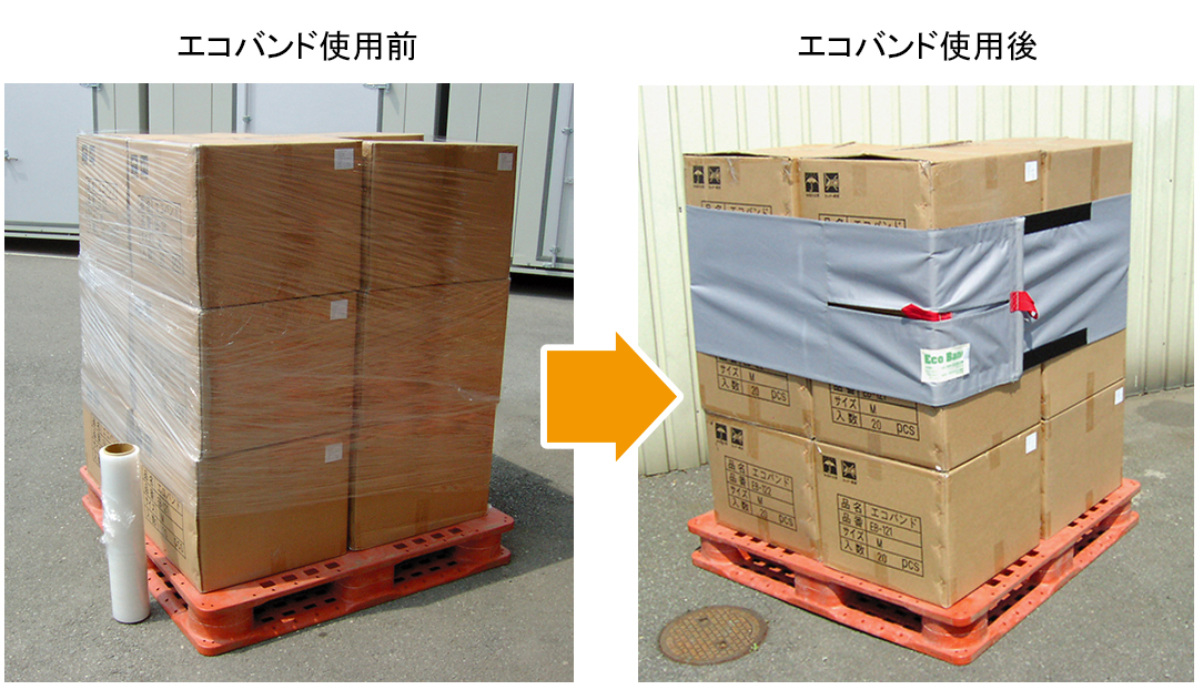 エコバンドを使用すれば、荷物の周りを1周して梱包終了。配達後もエコバンドを回収することにより、 ゴミゼロを実現できます。一見簡単すぎる梱包に見えますが、荷崩れ心配無用です。