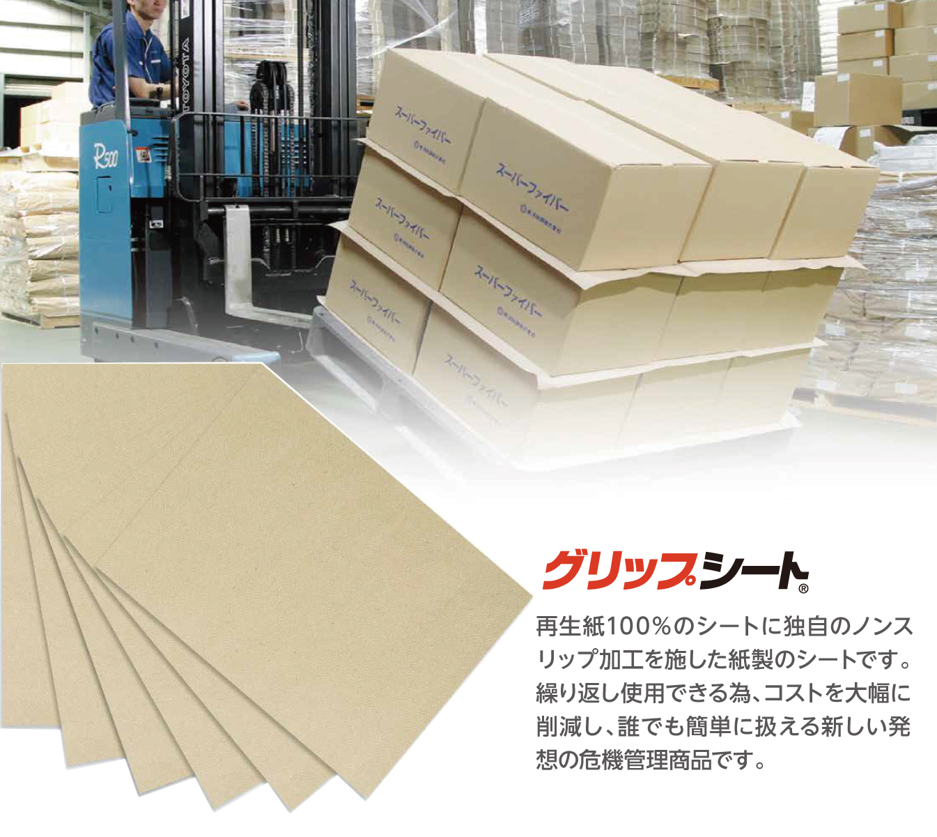 シートに施した「滑り止めコーティング」が荷物の載ったパレット全体を安定させます。さらにテープ、バンドなどと組み合わせれば、より荷物を安定させることができます。