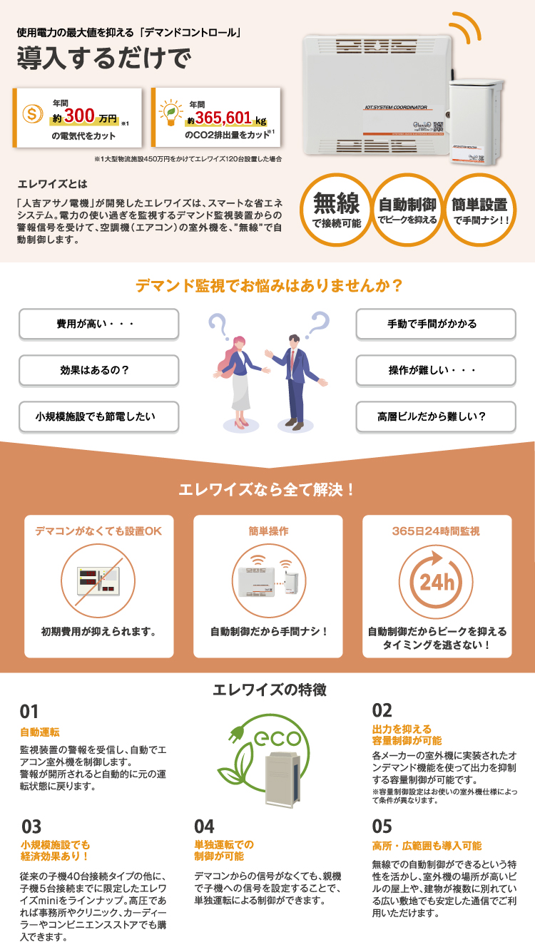 デマンド監視装置から警報信号を受けて、空調室外機の出力を自動で制御します。ピーク電力を抑えることで全体の最大需要電力を下げ、高圧電力契約の電気料金を削減するシステムです。
